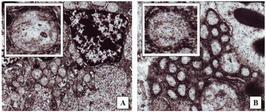 TEM (100,000×) images of rat duodenum after the administration of: (A) Distilled water; (B) Optimized insulin-loaded nanoparticle oily preparation. The upper left small pictures are enlargements of the endocytes seen in each picture.