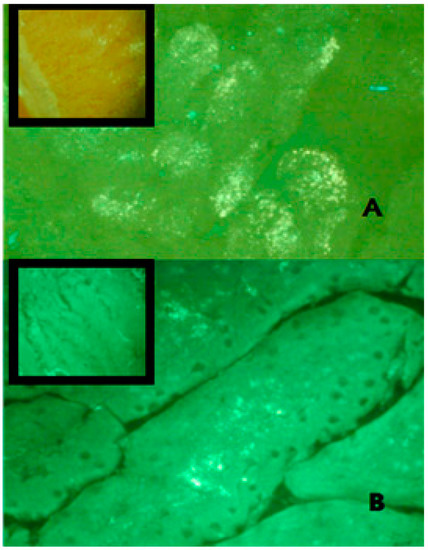 Frozen sections of rat duodenum administered with FITC-tagged insulin loaded nanoparticles investigated under a fluorescent microscope using a green filter (450–490 nm). Pictures were captured at 40× magnification at: (A) 1 h; (B) 2 h post administration. The fluorescence intensity was detected high in the duodenum of the rat 1 h post nanoparticle administration compared to the second hour sample. The oral administration of FITC-insulin aqueous preparation (upper left box) showed poor fluorescence intensity compared to the nanoparticle preparation.