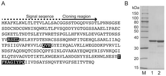 A BLAST search was conducted using an amino acid sequence (i.e., query) obtained by analyzing a draft genome (https://blast.ncbi.nlm.nih.gov). The search results indicated the target alginate-degrading enzyme belongs to the PL family 7 (Figure 1A). Moreover, it contains the conserved sequence QVH. Thus, we named the enzyme AlgSV1-PL7. An analysis using the SignalP 4.1 Server (http://www.cbs.dtu.dk/services/SignalP/) revealed that AlgSV1-PL7 contains a signal peptide, suggesting it is localized in the periplasm. We cloned rAlgSV1-PL7 lacking the signal peptide in an Escherichia coli expression system. The rAlgSV1-PL7 in E. coli BL21 cells was present in inclusion bodies, whereas 50% of the rAlgSV1-PL7 in E. coli SHuffle cells was in the soluble fraction. Additionally, E. coli SHuffle cells induced disulfide bonds in their expression system. Therefore, we purified the rAlgSV1-PL7 expressed in the E. coli SHuffle cells. An SDS-PAGE confirmed the purification of rAlgSV1-PL7 (Figure 1B, lane 2). Another Shewanella sp. YH1 alginate lyase, rAlgSI-PL7, was used as a control for the SDS-PAGE (Figure 1B, lane 1) because its theoretical molecular weight was similar to that of rAlgSV1-PL7. The theoretical pI and molecular weight of rAlgSV-PL7 without the signal peptide were 4.6 and 33,216.1 Da, respectively.