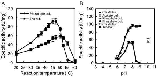 We examined the effects of temperature and pH on rAlgSV1-PL7 activity. A lyase activity assay with sodium alginate (1000 cps) as the substrate was used to calculate the specific activity. To determine the optimal temperature for rAlgSV1-PL7 activity, we examined the effects of Tris and phosphate buffers at temperatures between 20 and 60 °C. Interestingly, the enzymatic activity was about two times higher in the phosphate buffer than in Tris buffer, with an optimal temperature of around 45 °C (Figure 2A), which was consistent with the results of an earlier study involving AlgSI-PL7 []. Moreover, although the optimal pH for rAlgSV1-PL7 activity in the phosphate buffer was around 8.0, the enzyme retained its lyase activity between pH 7.5 and 9 (Figure 2B). The lyase activity in Tris buffer decreased when the pH exceeded 8.5. These results suggested that optimal rAlgSV1-PL7 activity was generally achieved under neutral conditions.