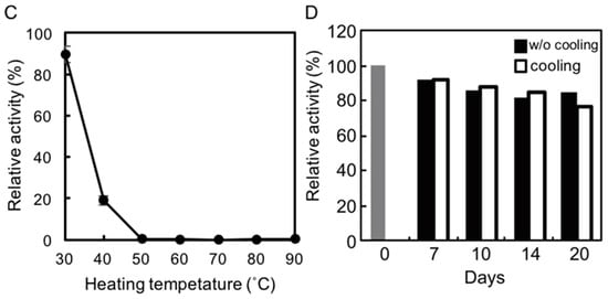 Although an Enzyme Commission (EC) number has not been assigned, some alginate lyases were recently observed to be active against both polyG and polyM. Thus, these enzymes degrade alginate to produce oligosaccharides more effectively than other enzymes with similar functions [,,]. Additionally, some alginate lyases are tolerant to heat, cold, and salt stresses [,,]. These characteristics are important for enzymes used in the commercial production of oligosaccharides. Furthermore, enzyme stability (i.e., long-lived activity) is also a key consideration, particularly for industrial applications, because long-lived enzymes can help to decrease the input costs related to oligosaccharide production.