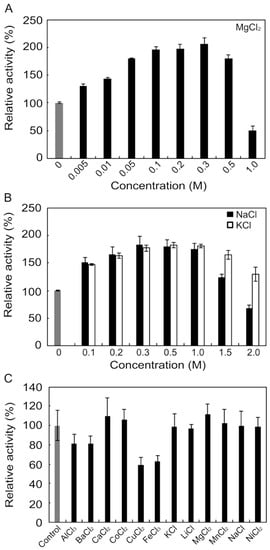 Effects of metals on rAlgSV1-PL7 activity. Effects of MgCl2 (A), NaCl (black), and KCl (white) (B) on rAlgSV1-PL7 lyase activity. (C) Effects of various metals (1 mM) on rAlgSV1-PL7 lyase activity. The activities are presented relative to the activity in the absence of metals. Each control was shown in grey bars.