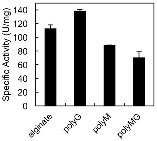 The application of algal biomass is expected to increase in various fields, including the commercial food and pharmaceutical industries [,,]. Alginate, which is a linear acidic polysaccharide, is located in the intercellular matrix of brown seaweed, representing about 30% of the dry weight of these seaweeds []. Additionally, it is currently used as an additive (i.e., as a stabilizer, viscosifier, and gelling agent) for food processing. The constituent sugar of alginate is β-d-mannuronic acid (M) linked to its C-5 epimer α-l-guluronic acid (G) with 1,4-O-glycoside bonds. Therefore, alginate consists of the following three blocks: two homopolymeric blocks [polyguluronic acid (polyG) and polymannuronic acid (polyM)] and one heteropolymeric block [random region (polyMG)] [,].