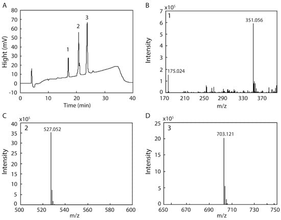 Several endo- and exotypes of alginate lyases (oligoalginate lyases) are typically involved in the degradation of alginate to monosaccharides. However, some alginate lyases can degrade alginate to mono-, di-, and trisaccharides by themselves. We examined the products resulting from the degradation of alginate by rAlgSV1-PL7 because of the broad substrate specificity of this enzyme. After a 48 h incubation, degraded fractions collected by HPLC were analyzed by electrospray ionization mass spectrometry (ESI-MS) (Figure 5). The result of the HPLC analysis indicated that we obtained three peaks (1: 17 min, 2: 20 min, 3: 23 min) (Figure 5A). Each peak was then used to determine the degradation products by ESI-MS. We detected four major peaks corresponding to a monosaccharide (Figure 5B: 175.024), disaccharide (Figure 5B: 351.056), trisaccharide (Figure 5C: 527.052), and tetrasaccharide (Figure 5D: 703.121), with m/z values that were consistent with those of previous reports [,,]. Although the main degradation products were tri- and tetrasaccharides, we also detected mono- and disaccharides. Therefore, the degradation of alginate by rAlgSV1-PL7 results in the production of one to four oligosaccharides.