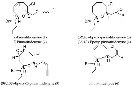 Z-Pinnatifidenyne and E-pinnatifidenyne (1–2) are representative and were reported in 1982 after isolation from the red algae Laurencia pinnatifida collected at Canary Islands [7]. Their structures were established by espectroscopic methods, X-ray diffraction analysis and chemical correlations, although, in 1991, the absolute configurations were reassigned based on a later X-ray analysis [8]. Recent synthetic approaches and biosynthetic studies of these eight-membered compounds have been reported [9,10].
