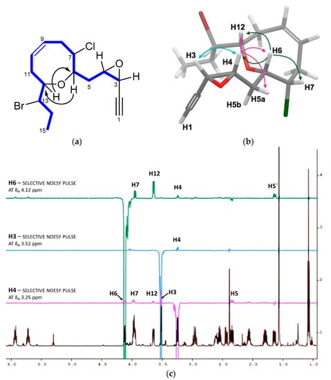 Compound 5 was isolated as an amorphous solid that was determined to have the molecular formula C15H20BrClO2 by HR-ESI-MS analysis. The presence in 5 of a terminal acetylene group conjugated with a double bond was evident from UV (Ultra Violet) [λmax (log ε) 225 (3.59) nm] and IR [νmax 3289 and 2300 cm−1] spectra. The 1H NMR experiment showed the characteristic shift signals at δH 3.17 (1H, br.s), 5.63 (1H, br.d, J = 10.8 Hz) and 6.05 (1H, ddd, J = 7.6, 7.7, 10.8 Hz) of the Z-enyne unit clearly related to Z-pinnatifidenyne (1). An extensive assessment of 1D and 2D NMR data (Table 2 and Table 3) compared to reported data for 1 [7] indicated that compound 5 differs to 1 containing an extra disubstituted epoxide situated at C-9–C-10. The relative configuration of 5 was determined by observation of dipolar correlations. Accordingly, the observed NOE enhancements from H-10 to H-9 and H-12, and from H-6 to H-7 and H-12 located all these protons on the same face of the molecule (Supplementary Materials, Figure S23). The above data and the coupling constant for 3JH9-H10 = 4.0 Hz provide evidence of the cis-orientation. This structure corresponds to a previously reported synthetic epoxide obtained by epoxidation of 1 and published by our group in 1982 [7]. However, the data published at that time and those obtained for our natural product did not correlate well. Therefore, to confirm the structure of 5 as (9R,10S)-epoxy-Z-pinnatifidenyne, we decided to repeat the selective epoxidation of 1. A product identical to 5 in all respects was obtained (see Experimental part).