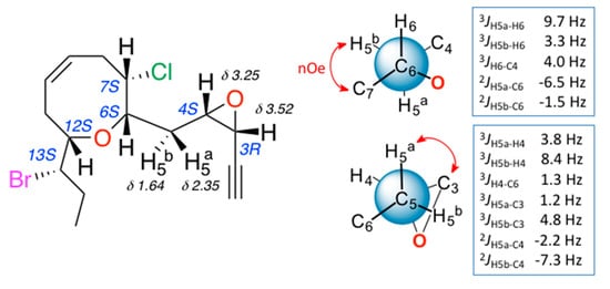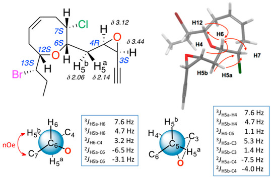 The stereochemical relationships between the different stereogenic centres, including those of epoxide, were performed using the above-described methods. The results of the NMR configurational analysis are shown in Figure 4. The conclusion was that compounds 3 and 4 share the relative configuration at centers C-6, C-7, C-12 and C-13, as well as the cis configuration of the epoxide, while the oxirane rings present an opposite relative configuration.