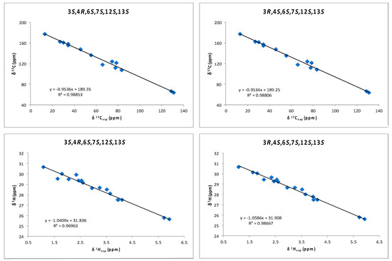Although a J-based configurational analysis on 3 and 4 was done to determine its relative configuration, a complementary computational study was undertaken. Chemical shift calculations of carbon atoms attached to halogens are not accurate or difficult to calculate due to spin–orbit contributions. However, Kutateladze et al. [17] have recently reported the use of parametric corrections to calculate 13C chemical shifts by DFT using inexpensive computations at the B3LYP/6-31G(d) level for structure optimization and using the ωB97xD/6-31G(d) level for the chemical shift calculations. Using this methodology, we built all possible stereoisomers for compound 3 followed by the corresponding conformational searches, structure optimizations and chemical shift calculations for each calculated conformer. As a result, it turned out that the 3R,4S,6S,7S,12S,13S isomer showed the lowest RMSD (Root Mean Square Deviation) for compounds 3 and 4 (see Supplementary Materials, Table S1). This result was coincident with our NMR-based proposal for the relative configuration of all stereogenic centers within the oxirane ring. However, it was clear that it was unable to solve the uncertainty within the oxirane ring. Taking into account that the previously mentioned methodology uses only 13C data, we decided to use chemical shift calculations of 1H for a second comparison as it has been shown that the combination of both chemical shifts yields better results [12,13,18,19,20]. Thus, models of the two possible diastereoisomers, 3S,4R,6S,7S,12S,13S (3a) and 3R,4S,6S,7S,12S,13S (3b), were built and conformational searches on each one, consisting on 5000 steps of a hybrid MCMM (Monte Carlo Multiple Minimum), Low-Mode sampling using the MMFF94 (Merck Molecular Force Field) force field, were completed. Redundant conformers within a 12 kJ/mol energy window of the global minimum found were eliminated using an RMSD cutoff of 1.0 Å. Next, all the resulting structures (seven conformers for 3a and five conformers for 3b) were geometrically optimized using DFT calculations [21] at the B3LYP/6-31G** level of theory with the LACVP basis set in gas phase [22]. NMR shielding constants (σ) were calculated according to the calculated relative Boltzmann populations for each conformer. Finally, NMR chemical shifts were obtained scaling the calculated values by linear regression analysis of experimental and computed data. In this analysis, the carbon nucleus with the attached bromine atom and the acetylenic proton were not included due to their high deviations. Correlation coefficients were almost identical for both stereoisomers (0.9885 for 3a vs. 0.9881 for 3b) using the 13C NMR data but clearly better for isomer 3b using 1H-NMR data (0.9867 vs. 0.9696) (Figure 5 and Supplementary Materials, Table S2). Calculation of the DP4 parameter [23] showed that the 3R,4S,6S,7S,12S,13S diastereoisomer (3b) is the most likely solution, with a probability 99.9% using both 13C and 1H data, therefore supporting our NMR-based proposal. Moreover, the same procedure was applied to fit the data of compound 4 to the calculated values for diasteroisomers 3a and 3b (Figure 6 and Supplementary Materials, Table S2). In this case, it turned out that the experimental data of 4 fitted better with calculated data for the 3S,4R,6S,7S,12S,13S diasteroisomer (3a), confirming that compounds 3 and 4 are the two-possible cis oxirane stereoisomers.