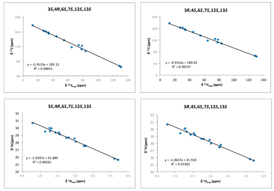 1H and 13C correlations between calculated isotropic shieldings for the two simulated diastereoisomers of (3,4)-epoxy-pinnatifidenyne and experimentally observed chemical shifts for compound 4. Fitting parameters are indicated.