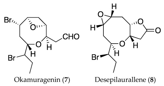 Structures of C12 metabolites isolated from Laurencia okamurai, okamuragenin (7) and desepilaurallene (8).