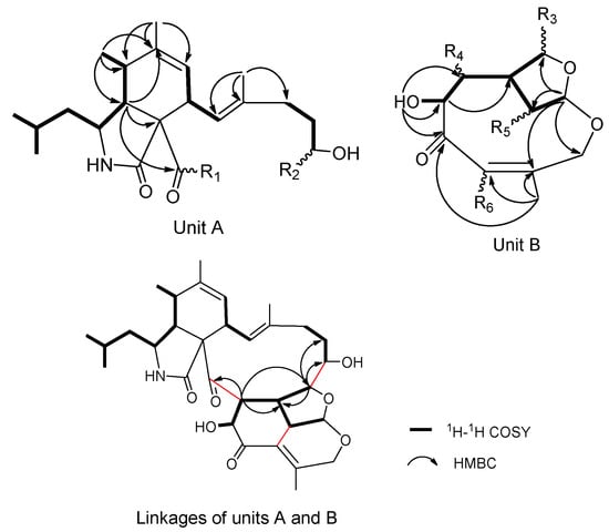 Partial structures of 1 based on 1H-1H correlation spectroscopy (COSY) and heteronuclear multiple bond correlation (HMBC) spectra.