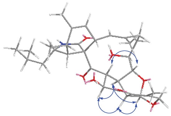 The planar structure of 1 was elucidated by 2D NMR spectrum. The 1H-1H correlation spectroscopy (COSY) cross peaks (Figure S8 in Supplementary Materials) of Me-23 (δH 0.93)/Me-24 (δH 0.96)/H-22 (δH 1.53)/H-10 (δH 1.49, 1.25)/H-3 (δH 2.97)/H-4 (δH 2.81)/H-5 (δH 2.67)/Me-11 (δH 1.18), H-7 (δH 5.45)/H-8 (δH 3.61)/H-13 (δH 5.70), H-15 (δH 2.07)/H-16 (δH 1.50, 1.30)/H-17 (δH 4.35) and heteronuclear multiple bond correlation (HMBC) correlations (Figure S9) from Me-12 (δH 1.77) to C-5 (δC 35.9), C-6 (δC 140.6) and C-7 (δC 125.6), from Me-25 (δH 1.57) to C-13 (δC 125.1), C-14 (δC 135.9) and C-15 (δC 36.9) established unit A, possessing a (2-methylpropyl) isoindolone moiety, which had two positions vacant to be linked, R1 and R2 (Figure 2). 11 carbon signals remained. The 1H-1H COSY cross peaks of H-26 (δH 5.91)/H-30 (δH 3.59)/H-19 (δH 2.25)/H-18 (δH 3.86) and H-19/H-20 (δH 3.51)/H-32 (δH 4.42)/OH-32 (δH 4.58), together with HMBC interactions from Me-33 (δH 1.85) to C-29 (δC 127.6), C-28 (δC 158.1) and C-31 (δC 197.0), from H-20 and OH-32 to C-31 were preliminarily attributed to unit B (Figure 2). Furthermore, the HMBC correlations from H-19 and H-20 to C-21 (δC 214.2), from H-18 to C-16 (δC 29.3), C-17 (δC 68.6) and C-19 connected R1 with R4, and R2 with R3 respectively. To satisfy the unsaturation, R5 and R6 were linked. Thus, the gross planar structure of 1 was established.