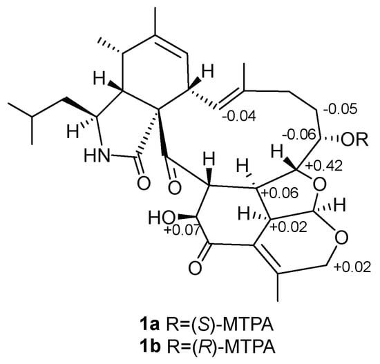 The relative stereochemistry of 1 was determined with the help of 1H NMR coupling constants, nuclear Overhauser effect spectroscopy (NOESY) experiments, and comparison with those of reported aspochalasins. The NOESY cross peaks (Figure S10) among H-5, H-4 and H-8 demonstrated the relative configurations of the isoindolone moiety in accordance with those of reported cytochalasans [,]. For the macrocyclic part, the NOESY correlations of H-17, H-18 and H-20 suggested they were cofacial. The double peak of H-18 with big coupling constants between H-19 reflected the trans-orientation of these two atoms. For the penta-heterocycle moiety, both H-19 and H-30 were located at the joint of three cycles, which elucidated the axial bond in these two atoms. Additionally, the NOESY correlations between H-19, H-30, H-26 and H-32 established that these moieties had the same orientation (Figure 3). The modified Mosher’s method using (S)/(R)-α-methoxy-α-(trifluoromethyl) phenylacetyl (MPTA)-Cl was applied to assign the absolute configuration of 1. The positive and negative value disposition (ΔδS-R) of the Mosher’s ester derivatives (1a and 1b) established the absolute configuration of C-17 as S (Figure 4). It is noteworthy that in all natural cytochalasans, so far, the stereochemistry of perhydroisoindol-1-one moiety is the same [,] which assigned the absolute configurations for C-3, C-4, C-5,C-8 and C-9 as 3S, 4R, 5S, 8S, 9S, respectively. Therefore, the complete absolute stereochemistry of 1 could be assigned as 3S, 4R, 5S, 8S, 9S, 17S, 18R, 19R, 20R, 26R, 30S, 32S and named as Tricochalasin A.