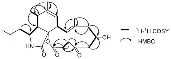 Compound 2 was isolated as a white solid. Its molecular formula was deduced to be C24H35NO5 (8 degrees of unsaturation) by positive-mode high-resolution electrospray ionization mass spectrometry (HR-ESIMS) ion peaks at m/z 418.2589 [M + H]+ (calcd. 418.2549 for C24H36NO5) and m/z 440.2406 [M + Na]+ (calcd. 440.2368 for C24H35NO5Na), combined with 1D NMR data. Analysis of the 1H NMR and 13C NMR spectrum data recorded in CDCl3 revealed the presence of (2-methylpropyl) isoindolone moiety similar to those found in 1. 13C NMR and DEPT spectra showed 24 carbon resonances including one ketone carbonyl (δC 208.9), one ester/lactone carbonyl (δC 171.9), one amide carbonyl (δC 172.4), four olefinic carbon (δC 123.5, 123.8, 138.2 and 140.9), five aliphatic methylene carbons (δC 46.8, 33.1, 32.3, 29.0 and 34.1), six aliphatic methine carbons (δC 25.6, 52.3, 52.4, 34.8, 41.1 and 75.1), five methyl signals (δC 21.1, 23.8, 14.3, 20.1 and 17.7) and one quaternary carbon (δC 86.5) (Table 1). These features characteristically suggested 2 belongs to the same structural family as 1. Comparison with reported aspochalasin derivatives indicated that 2 was similar to aspochalasin A1 []. The planar structure of 2 was elucidated by 1H-1H COSY and 1H-13C HMBC experiments (Figure 5). 1H-1H COSY cross peaks (Figure S20) of the H-15 (δH 2.14, 2.27)/H-16 (δH 4.42)/H-17 (δH 2.04, 2.28) established the position of the hydroxyl group at C-16 (δC 75.1) and the H-19 (δH 2.32, 3.02)/H-20 (δH 2.44, 2.62) pairs located the ketone carbonyl group at C-18 (δC 208.9). The key HMBC correlations (Figure S21) from H-17 to C-16 and C-18, from H-15 to C-16 and C-14 (δC 138.2) and from H-19, H-20 to C-18 and C-21 (δC 171.9) also demonstrated the structural features.