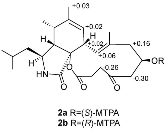 The absolute configuration of C-16 in 2 was established by the convenient Mosher’s ester. The difference in chemical shift values of the easters 2a and 2b was calculated to assign the absolute configuration at C-16 as R (Figure 6). Thus, the absolute configuration of 2 was deduced as 3S, 4R, 5S, 8S, 9S, 16R and named as aspochalasin A2.