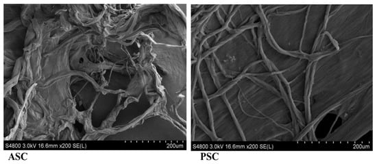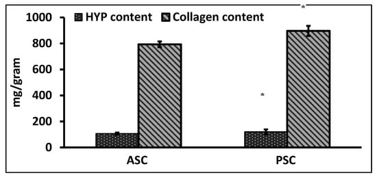 The quantification of total collagen content from hydroxyproline (Hyp) was determined as per the earlier method []. In general, the PSC had a high content of Hyp than ASC, similarly the collagen content was also high in PSC. The hydroxyproline and collagen contents of PSC and ASC were about 120 and 106.36 mg/g and, 896.738 and 793.49 mg/g, respectively (Figure 1). The present result was in accordance with the hydroxyproline content of collagen from silvertip shark (113 and 105 mg/g) and brownbanded bamboo shark (103.71 mg/g) [,]. The hydroxyproline content may depend on the seasonal variations and body temperature of the fish species.