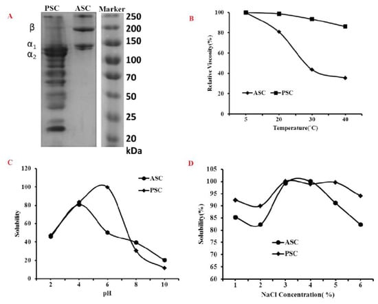 Electrophoretic profile (A), viscosity (B) and solubility against pH (C) and salt (D) of blue shark skin collagen. ASC-Acid soluble collagen, PSC-pepsin soluble collagen.