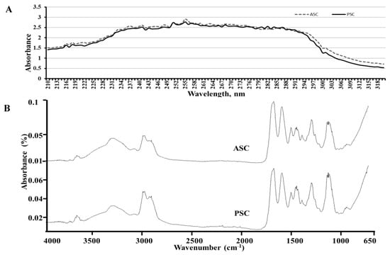 The UV absorbance pattern of blue shark skin collagen was presented in Figure 3A. Both collagens, PSC and ASC, had a UV maximum absorption at 225 nm. It was reported that the major functional groups (-COOH, C=O and CO-NH2) of collagen tend to absorb UV light []. An earlier study revealed that the purity of collagen was indirectly measured by the absence of UV absorption at 280 nm since the non-collagen proteins tend to absorb maxima at this particular UV wavelength [].