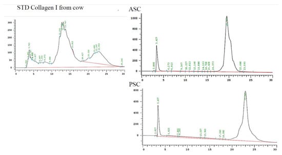 In order to confirm the purity, the extracted blue shark skin collagens were eluted through RP-HPLC column and compared with standard bovine collagen. As shown in Figure 4, there were two main chromatogram peaks eluted at 3.427 and 19.0 min for ASC and 3.407 and 22.980 min for PSC, respectively. The first peak observed at 3.4 was the acetic acid peak. The present observation was in accordance with a previous report []. Compared to the standard bovine collagen, the blue shark fish collagen showed a dissimilar chromatographic pattern. We speculated that this might be due to the difference in their molecular arrangements between mammalian and fish collagen. Also, the RP-HPLC pattern confirmed that extracted collagen was pure and free from non-collagen protein and other contaminants, further justifying the SDS-PAGE data of collagen (Figure 2A).