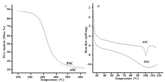 Thermal properties such as the material weight loss towards temperature and the thermal disintegration configuration of the blue shark skin collagens were evaluated by the thermogravimetric analyzer (TGA). From the TGA curves, 50% weight loss in ASC and PSC were observed at 339 and 342 °C, respectively (Figure 5A). At high temperature (650 °C), the mass weight of ASC and PSC were about 22.53 and 23.64, respectively.