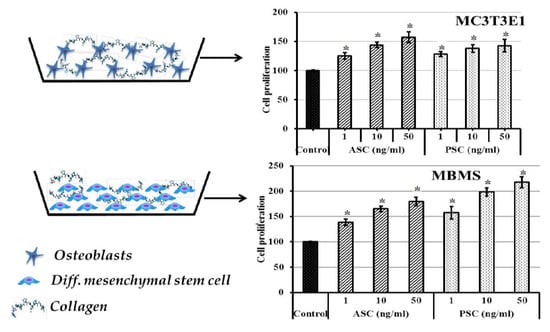 The effect of blue shark skin collagen on differentiated bone cells proliferation. MBMS: differentiated mouse bone marrow mesenchymal stem cells, MC3T3E1- differentiated-osteoblasts, ASC-Acid soluble collagen, PSC-pepsin soluble collagen. For differentiation, MBMS and MC3T3E1 cells were cultured with osteoblast differentiation medium for 21 days. * p < 0.05 vs control.