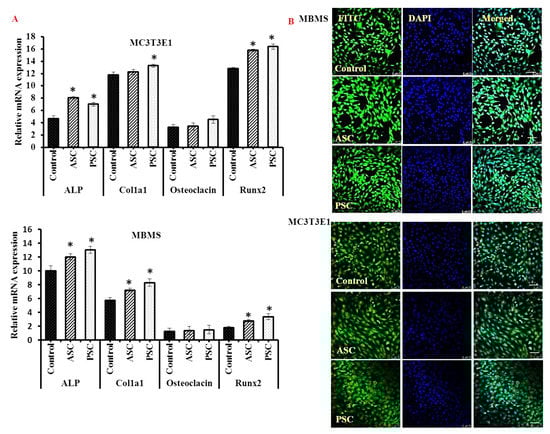 mRNA (A) and confocal images (B) of blue shark collagen treated bone cells. Scale bars: 75 micrometers. MBMS: differentiated mouse bone marrow mesenchymal stem cells, MC3T3E1- differentiated osteoblasts, ASC-Acid soluble collagen, PSC-pepsin soluble collagen. For differentiation, MBMS and MC3T3E1 cells were cultured with osteoblast differentiation medium for 21 days. * p < 0.05 vs. control.