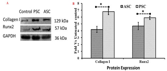 Osteogenic regulatory protein expressions (Collagen I and Runx2) of bone cells (differentiated MBMS) treated with blue shark skin collagen by western blot assay. (A) Level of osteogenic protein expression of bone cells (B) Fold changes of osteogenic protein expression compared to control (GAPDH). ASC-Acid soluble collagen, PSC-Pepsin soluble collagen. For differentiation, MBMS cells were cultured with osteoblast differentiation medium for 21 days, * p < 0.05.