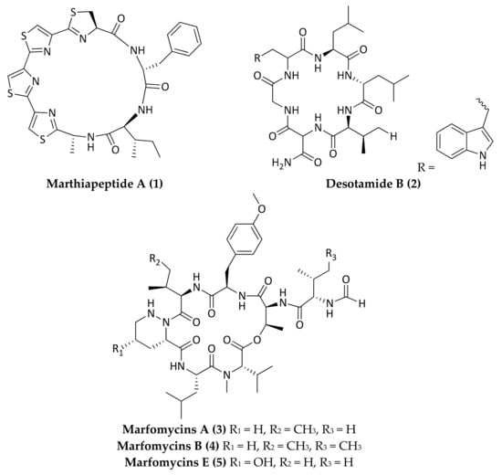 - Zhou, X.; Huang, H.; Chen, Y.; Tan, J.; Song, Y.; Zou, J.; Tian, X.; Hua, Y.; Ju, J. Marthiapeptide A, an anti-infective and cytotoxic polythiazole cyclopeptide from a 60 L scale fermentation of the deep sea-derived Marinactinospora thermotolerans SCSIO 00652. J. Nat. Prod. 2012, 75, 2251–2255. [Google Scholar] [CrossRef] [PubMed]