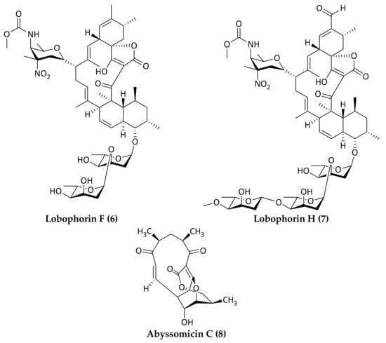 - Niu, S.; Li, S.; Chen, Y.; Tian, X.; Zhang, H.; Zhang, G.; Zhang, W.; Yang, X.; Zhang, S.; Ju, J.; et al. Lobophorins e and F, new spirotetronate antibiotics from a South China Sea-derived Streptomyces sp. SCSIO 01127. J. Antibiot. (Tokyo) 2011, 64, 711–716. [Google Scholar] [CrossRef] [PubMed]