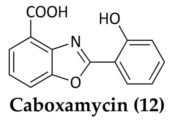 - Hohmann, C.; Schneider, K.; Bruntner, C.; Irran, E.; Nicholson, G.; Bull, A.T.; Jones, A.L.; Brown, R.; Stach, J.E.; Goodfellow, M.; et al. Caboxamycin, a new antibiotic of the benzoxazole family produced by the deep-sea strain Streptomyces sp. NTK 937. J. Antibiot. (Tokyo) 2009, 62, 99–104. [Google Scholar] [CrossRef] [PubMed]
