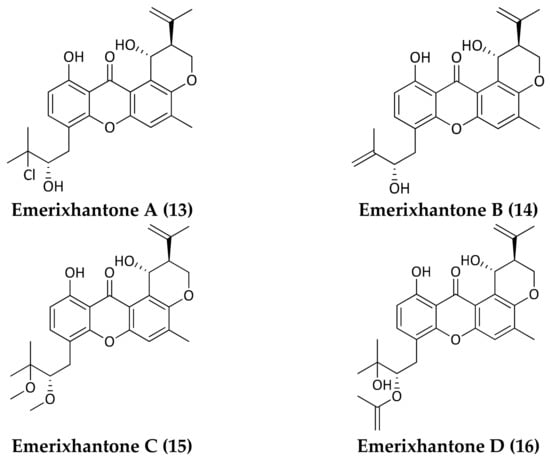 - Fredimoses, M.; Zhou, X.; Lin, X.; Tian, X.; Ai, W.; Wang, J.; Liao, S.; Liu, J.; Yang, B.; Yang, X.; et al. New prenylxanthones from the deep-sea derived fungus Emericella sp. SCSIO 05240. Mar. Drugs 2014, 12, 3190–3202. [Google Scholar] [CrossRef] [PubMed]