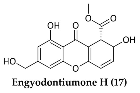 | Engyodontium album (DFFSCS021) | 3739 m | South China Sea, People’s Republic of China | Engyodontiumone H (17) | Xanthone-derivative | E. coli; B. subtilis | Yao et al., 2014 | |