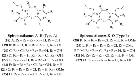 - Niu, S.; Liu, D.; Hu, X.; Proksch, P.; Shao, Z.; Lin, W. Spiromastixones A-O, antibacterial chlorodepsidones from a deep-sea-derived spiromastix sp. fungus. J. Nat. Prod. 2014, 77, 1021–1030. [Google Scholar] [CrossRef] [PubMed]