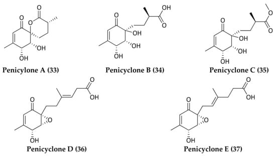 - Guo, W.; Zhang, Z.; Zhu, T.; Gu, Q.; Li, D. Penicyclones A-E, Antibacterial Polyketides from the Deep-Sea-Derived Fungus Penicillium sp. F23-2. J. Nat. Prod. 2015, 78, 2699–2703. [Google Scholar] [CrossRef] [PubMed]