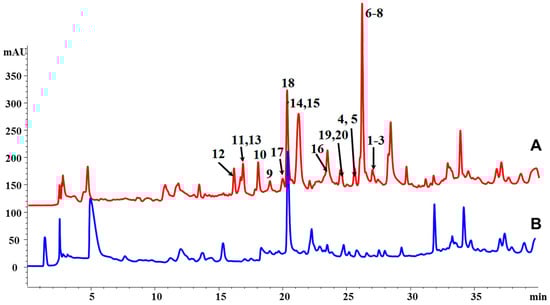 High Performance Liquid Chromatography (HPLC) analysis of the secondary metabolites of P. chrysogenum HLS111. (A) Test group (with valproic acid (VPA)). Peak numbers match the compound numbers in Figure 2 and Supplementary Materials Figure S1. (B) Control group.