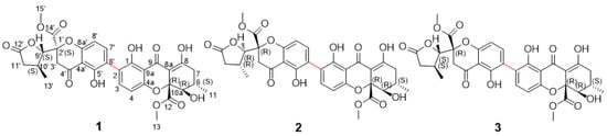 - Elsässer, B.; Krohn, K.; Flörke, U.; Root, N.; Aust, H.J.; Draeger, S.; Schulz, B.; Antus, S.; Kurtán, T. X-ray structure determination, absolute configuration and biological activity of phomoxanthone A. Eur. J. Org. Chem. 2005, 2005, 4563–4570. [Google Scholar] [CrossRef]