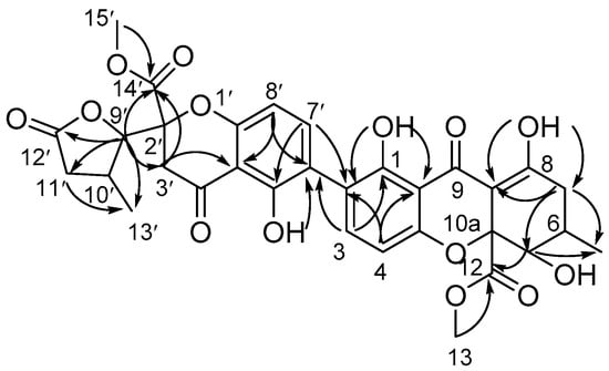 Chrysoxanthones A (1) and B (2) were attained as a pale yellow powder. They showed identical 1H and 13C NMR spectra (Table 1, Supplementary Materials Figures S4, S5, S10, and S11), despite they were separated using a nonenantioselective method, presuming they were isomers but not enantiomers. By comparison of the NMR data (Table 1) with the structurally related compounds, they were identified as the tetrahydroxanthone–chromanone lactone heterdimers [,,]. The HMBC correlations of H-3 to C-6′ and H-7 to C-2 indicated the monomers of compounds 1 and 2 were connected by a 2-6′ linkage (Figure 3, Supplementary Materials, Figures S6 and S12). The 1H and 13C NMR data (Table 1) of 1 and 2 were in agreement with those for blennolide J [], which suggested they might have the same planar structures. The key coupling constants in 1H NMR spectra (Table 1, Supplementary Materials, Figures S4 and S10), the key Rotating Frame Overhauser Effect Spectroscopy (ROESY) correlations (Figure 4) and NMR data rules could prove the relative stereochemistry of 1 and 2. The trans-configuration of H-5 and H-6 of the tetrahydroxanthone monomer was established by chemical shifts (compounds 1 and 2 δ5-H/C 3.93/76.9, δ6-H/C 2.42/29.2 vs. blennolide I δ5-H/C 4.12/71.3, δ6-H/C 2.11/28.5; cis-configuration) and the coupling constant (3JH-5/H-6 = 11.5 Hz) [], as well as the ROESY correlation between H-5 (δH 3.93) and H-11 (δH 1.18). The ROESY correlation between H-13 (δH 3.68) and H-6 (δH 2.38) revealed the relative configurations of chiral carbons 5, 6, and 10a to be (5S, 6R, 10aS, or 5R, 6S, 10aR) (Figure 4C). Coupling constant 3JH-9′/H-10′ = 4.0 Hz established the trans-configuration of H-9′ and H-10′ of the β-methyl-γ-lactone moiety. Since the biaryl bond could rotate, it was ambiguous to determine the relative stereochemistry of carbon 2′ based on ROESY correlations. However, a summary of the NMR data [,,] could provide some clues to identify the relative configurations of C-2′ and C-10′. When the difference between the H-3a’ and H-3b’ values was greater than 0.41 ppm, the relative configurations were proposed to be 2′S, 10′R or 2′R, 10′S, while when it was less than 0.19 ppm, the relative configuration was 2′S, 10′S or 2′R, 10′R. Thus, the relative configurations of 1 and 2 were the same as those of blennolide J [], but the optical rotation data and CD spectra of compounds 1 and 2 were opposite to those of blennolide J (compound 1 +30.8 (c 0.05, MeOH), compound 2 +58.4 (c 0.15, MeOH), blennolide J −93.5 (c 0.08, CHCl3)) [], indicating the absolute configurations of two subunits of compounds 1 and 2 were the same or enantiotropic to those of blennolide J. Then, the absolute structures of compounds 1 and 2 were suggested to be (1a/2a (5R,6S,10aR,2′S,9′S,10′S); 1b/2b (5R,6S,10aR,2′R,9′R,10′R); 1d/2d (5S,6R,10aS,2′R,9′R,10′R)). The absolute configurations of compounds 1 and 2 were determined by comparing experimentally measured CD spectra with those calculated with the Time-Dependent Density Functional Theory (TD-DFT) method. The experimental electronic circular dichroism (ECD) spectrum of compounds 1 and 2 matched very well with the theoretical ECD spectrum for 1a(5R,6S,10aR,2′S,9′S,10′S) and 2b(5R,6S,10aR,2′R,9′R,10′R) (Figure 5A,B), respectively, confirming the absolute structures of 1 and 2.