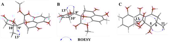 (A) Key Rotating Frame Overhauser Effect Spectroscopy (ROESY) correlations of β-methyl-γ-lactone moiety in compounds 1 and 2; (B) key ROESY correlations of β-methyl-γ-lactone moiety in compound 3; (C) key ROESY correlations of tetrahydroxanthone moiety in compounds 1–3.