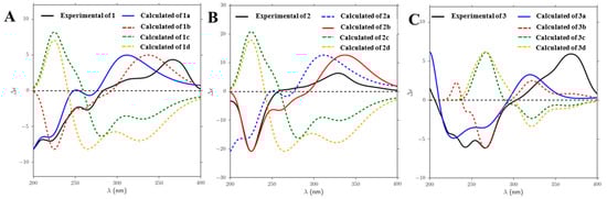 Experimentally measured and calculated electronic circular dichroism (ECD) spectra for compounds 1–3.