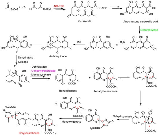 Plausible biosynthetic pathway of chrysoxanthones. Note: chiral carbons were marked with the red stars.