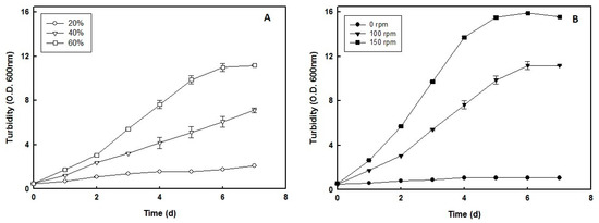 Oxygen supply is essential for optimal growth and carotenoid production in haloarchaea [15]. The influence of air volume inside the culture flasks on the growth rate of H. mediterranei was evaluated while all the other culture conditions were kept constant. This study was not aimed at determining the optimal air phase volume for production of H. mediterranei as it depends on the cultivation system design and parameters specifically selected in each production process. However, an air phase volume was used in this study so that the oxygen availability allowed H. mediterranei to complete growth until the stationary phase. Air occupying 20%, 40%, or 60% of the culture flask volume was kept in contact with the cell culture in liquid medium and agitated at 100 rpm. In the growth conditions and cultivation system used in this study (see Materials and Methods), the optimal growth rate for H. mediterranei was observed in the culture with 60% air phase in the flask, thus emphasizing the importance of oxygen for this haloarchaeon (Figure 1A). Experiments with 80% air phase in the flask did not suppose a significant improvement of the harchaeal productivity (data not shown).