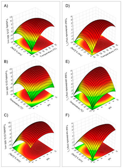 On the other hand, the maximum total carotenoid content in cultures of H. mediterranei cells should be observed at 36.81 °C, pH of 8.96, and 12.03% of NaCl. The carotenoid content at any point during the culture and different conditions could be predicted according to the following equation:
