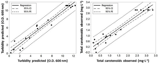 The accuracy of the model was verified by analyzing the predicted and observed experimental results. Three experiments were carried out to determine the reliability of optimal conditions predicted by the models of Equations (1) and (2), using the data obtained for biomass and total carotenoid content, respectively. Figure 3 shows that high values of R2 (93.1%) and adjusted R2 (92.7%) highlight the agreement between predicted and observed experimental values. Hence, an acceptable relationship between independent variables (temperature, pH, and salinity) and response variables (growth and total carotenoids) was proved. The highest biomass production (21.95 ± 1.57 g dry weight/L) and total carotenoid content (3.74 ± 0.20 mg/L) were very close to the values estimated using RSM at the optimal conditions (20.18 ± 1.02 g dry weight/L, and 3.34 ± 0.29 mg/L, respectively) indicating that RSM is effective in fixing culture conditions where several variables could influence the final result. It can also predict results for other potential culture conditions of the haloarchaea, as reported by the authors of Reference [14], in similar studies on Halorubrum sp. TZB126.