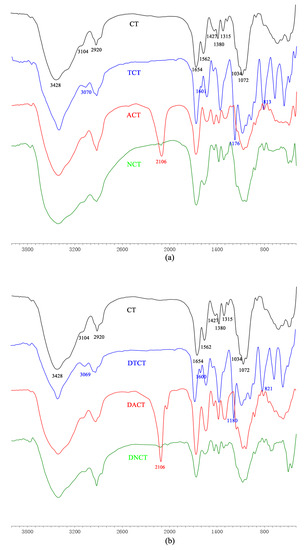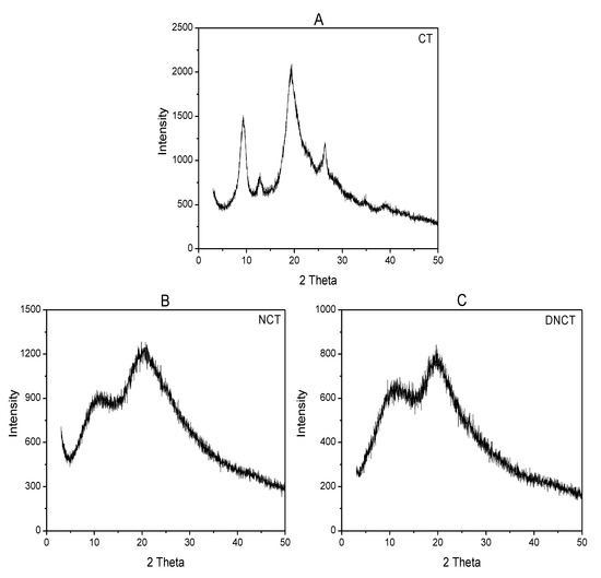 The X-ray diffraction pattern for CT, NCT, and DNCT were given between 5° and 60° of 2θ in Figure 3. CT peaks were observed at 9.3°, 12.8°, 19.4°, and 25.3°. Two of them are sharp (9.3° and 19.4°) and the other two are faint [6,30]. Compared with CT, the XRD patterns of NCT and DNCT exhibited some changes in their angles, peak intensity, and peak width. The sharp peak of CT at 9.3° shifted to 11.0° and 11.2° in the patterns of NCT and DNCT. Similarly, the sharp peak at 19.4° shifted to 19.6° and 19.8° in the patterns of NCT and DNCT. Both sharp peaks of NCT and DNCT were apparently broader than those of CT. Meanwhile, intensity of both peaks decreased along with the disappearance of both peaks (12.8° and 25.3°). The disappearance peaks of both may be due to the destruction of hydrogen bonding [31].