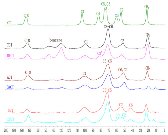In the 13C NMR spectrum of CT, the signals at 104 ppm, 83 ppm, 76 ppm, 74 ppm, 61 ppm, and 55 ppm were assigned to C1, C4, C5, C3, C6, and C2, respectively [28,29]. In addition, the CH3 group of the acetyl moiety gave a signal at 23 ppm, while its carbonyl group produced a peak at 173 ppm.