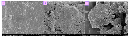 The morphology of CT, NCT, and DNCT were studied by scanning electron microscopy (SEM) (Figure 4). CT exhibited compact and flat morphology, while NCT and DNCT showed loose and porous structures. According to the results, we speculated that the morphology structure of CT changed as a consequence of the formation of a chitin derivative. It was concluded that loose and porous structure result in weaker thermal stability of NCT and DNCT.