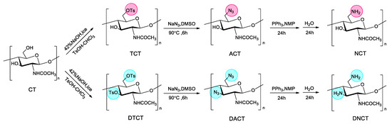 CT was supplied by Sinopharm Chemical Reagent Co., and deacetylation degree (DD) of 10%. The DD was determined by elemental analysis. The other reagents such as dimethyl sulfoxide (DMSO), sodium azide, triphenylphosphine (Ph3P), acetic anhydride, trichloromethane, 4-toluene sulfonyl chloride, etc., were supplied by Sinopharm Chemical Reagent Co., Ltd. (Shanghai, China).