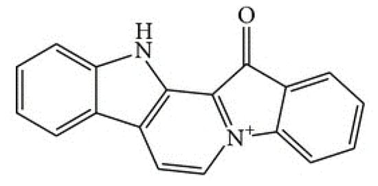The marine drug fascaplysin (12,13-Dihydro-13-oxopyrido[1,2-a:3,4-b′] diindol-5-ium chloride) is a red bis-indole alkaloid of the Fascaplysinopsis Bergquist sp. sponge which was isolated by Roll et al. in 1988 [8]. The structure of fascaplysin is shown in Figure 1. Novel derivatives comprise 3-bromo-fascaplysin, 4-chloro-fascaplysin, and 7-phenyl-fascaplysin, among others. Fascaplysin possesses antibacterial, antifungal, and antiviral properties as well as antiangiogenic and antiproliferative activity against a range of cancer cell lines [9,10,11]. Cyclin-dependent kinase 4 (CDK4) was reported as the main target of fascaplysin (IC50 of 0.35 μM), and accordingly, drug-treated cancer cell lines arrested preferentially in the G0/1 cell cycle phase [12,13,14]. Minor activity of fascaplysin was observed against other CDKs with IC50 of >100 μM for CDK1, >50 μM for CDK2 as well as 20 μM for CDK5 [14]. In addition, fascaplysin was demonstrated to exhibit DNA-intercalating capability with an affinity similar to those of other typical DNA intercalators [15]. Non-planar derivatives of fascaplysin have been developed in order to possibly reduce non-CD4-mediated cytotoxic effects [16].