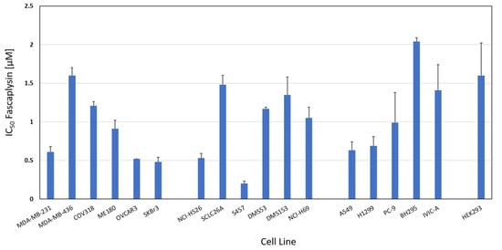 The chemosensitivity of a range of cancer cell line to fascaplysin was measured in MTT cytotoxicity assays. Figure 2 shows the IC50 values of breast cancer and ovarian cell lines (range: 0.48–1.21 µM), SCLC cell lines (range: 0.2–1.48 µM) and NSCLC cell lines (range: 0.63–2.04 µM). Whereas SCLC and breast/ovarian cancer cell lines exhibited similar mean IC50 values (0.96 ± 0.5 versus 0.89 ± 0.45 µM), NSCLC cell lines proved to be less sensitive (1.15 ± 0.59 µM). SCLC26A and S457 are primary SCLC cell lines derived from pleural effusions of patients before and after therapy failure, respectively. The nonmalignant HEK293 cell line showed an IC50 value of 1.6 ± 0.42 µM. BH295 and IVIC-A are primary NSCLC cell lines derived from pleural effusions of patients with ALK and EGFR TKI resistance. Numrical values of the IC50 data are presented in Supplementary Table S1.