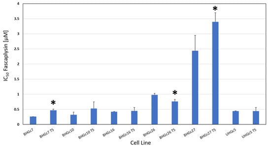 The SCLC CTCs form spontaneously large spheroids which are markedly chemoresistant to cisplatin and other drugs used for the treatment of SCLC patients in comparison to CTCs in form of single cell suspensions. The chemosensitivity of such single cell suspensions and tumorospheres against fascaplysin were compared in MTT tests (Figure 3). With exception of BHGc26 and 27 CTC lines, fascaplysin IC50 values of the other lines were equal or below 0.5 µM. A comparison of the ratios of IC50 values of single cell suspensions and tumorospheres for cisplatin and fascaplysin demonstrates that for fascaplysin, the differences in chemosensitivities between these 2D- and 3D-cultures are much less than for the platinum drug (Table 1) indicating superior anticancer activity for spheroids.